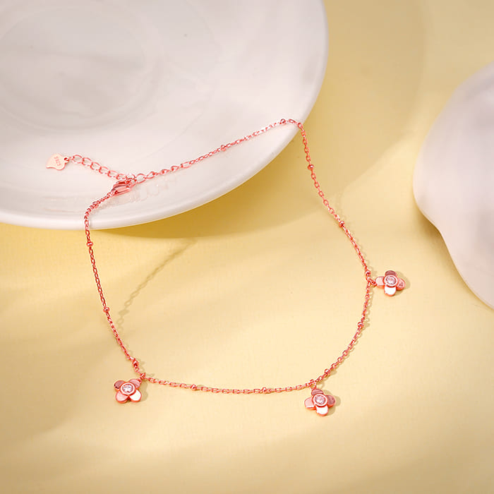 This rose gold anklet features three dangling flower charms, each adorned with a shimmering zircon.