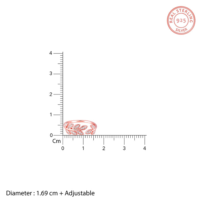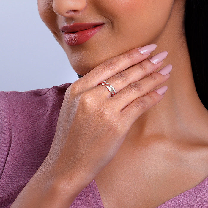 This rose gold ring has an open design, with two leaf branches sporting zircons on both ends.