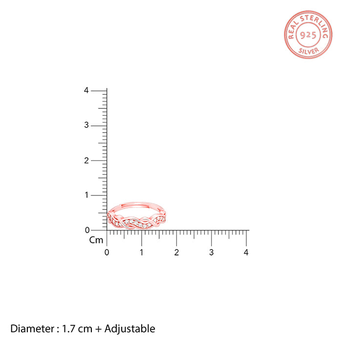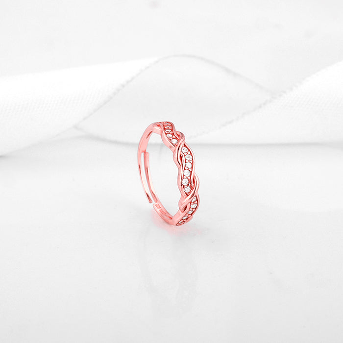 This rose gold ring has double waves entangling with each other, one set in zircons and the other in plain metal.