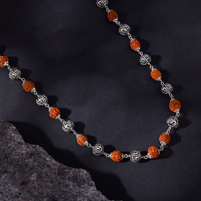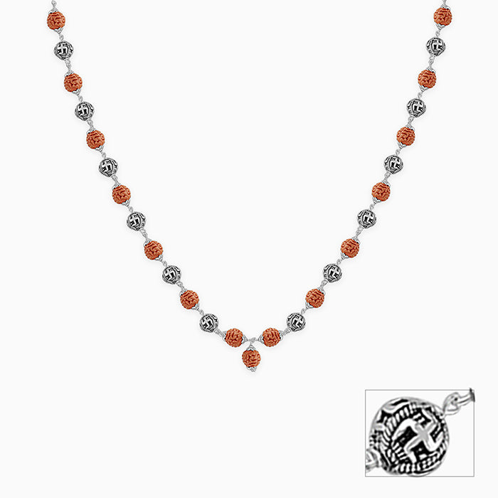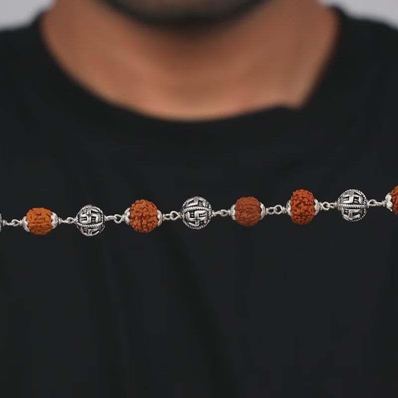 This silver chain for men blends tradition with bold style. Oxidized silver meets the sacred Swastik symbol and Rudraksh stone, reflecting strength, focus, and timeless confidence. A modern talisman for the man who carries his roots with pride.