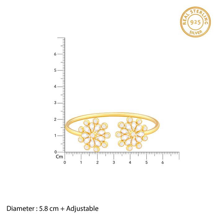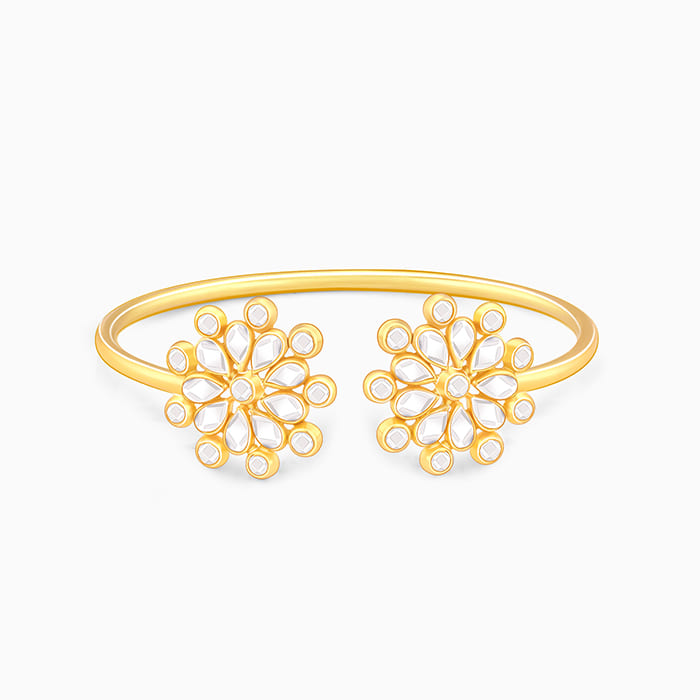 This golden open-design bracelet features two royal flower motifs on both ends with rose-cut glass stones. Presenting GIVA's chic #VivaahDaSwag Collection for an unforgettable wedding.