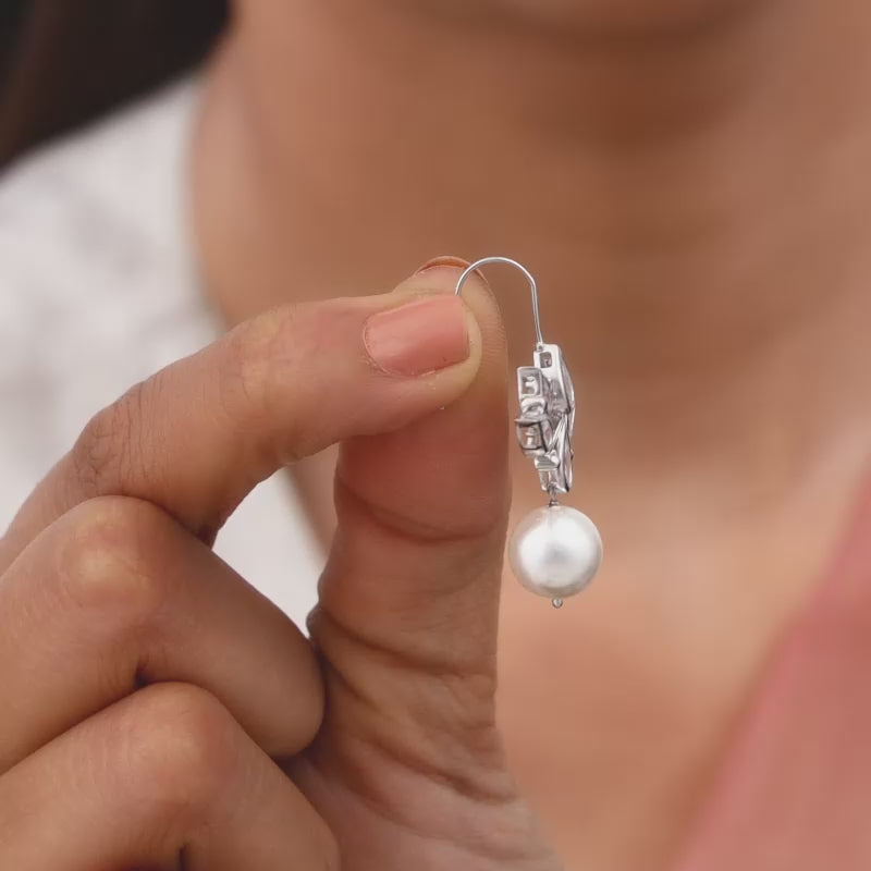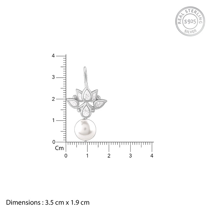 These silver dangler earrings have a lotus design studded with zircons featuring a large pearl in the bottom.