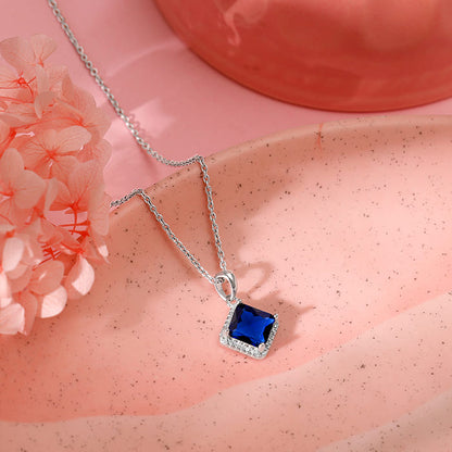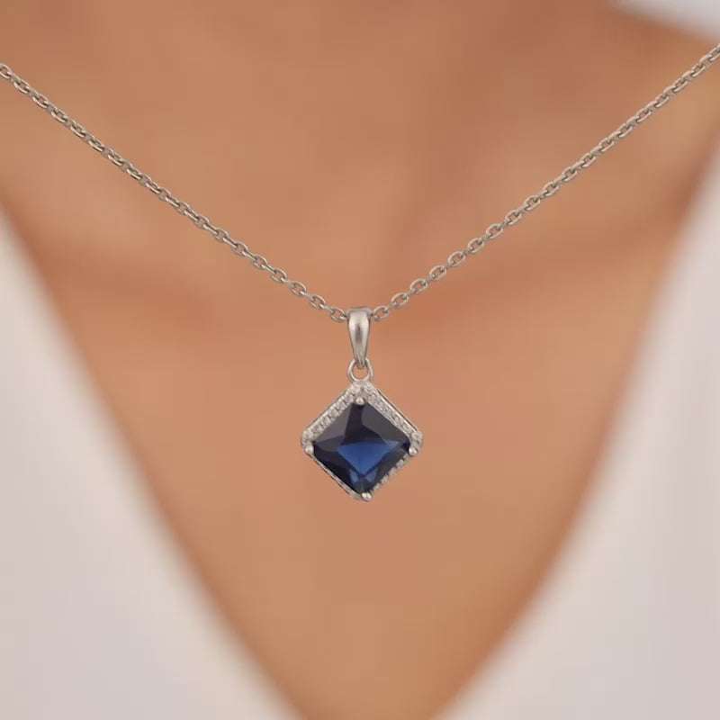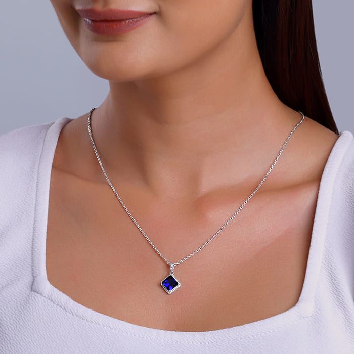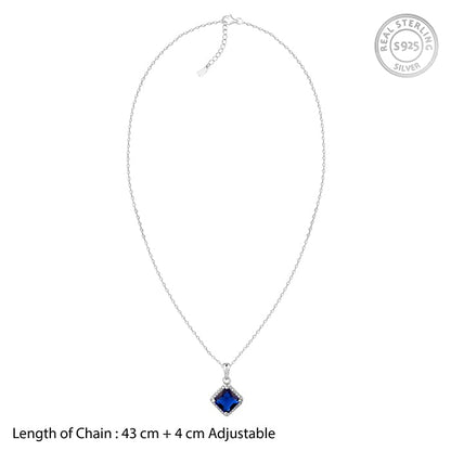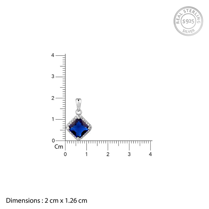 This silver pendant features a rhombus design, with a blue-coloured stone at the centre and zircons studded around.