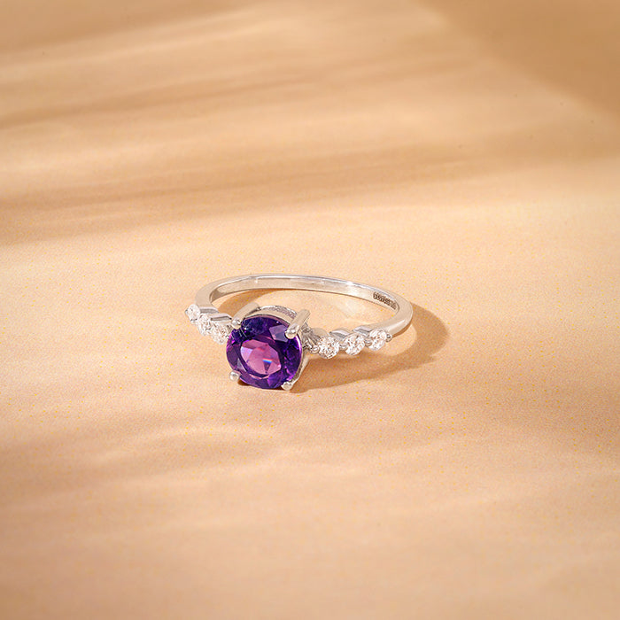 This silver womens ring showcases a natural circular-shaped amethyst at the centre. The band is accented on each side by a curving line of smaller zircons. From nature’s heart to yours - GIVA's natural Gemstone Collection makes every occasion special, whether you’re gifting a loved one or treating yourself.
