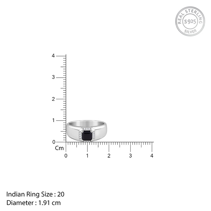 This silver ring for men features a square-shaped coloured stone at its centre, and the stone is framed by pave-set zircons.