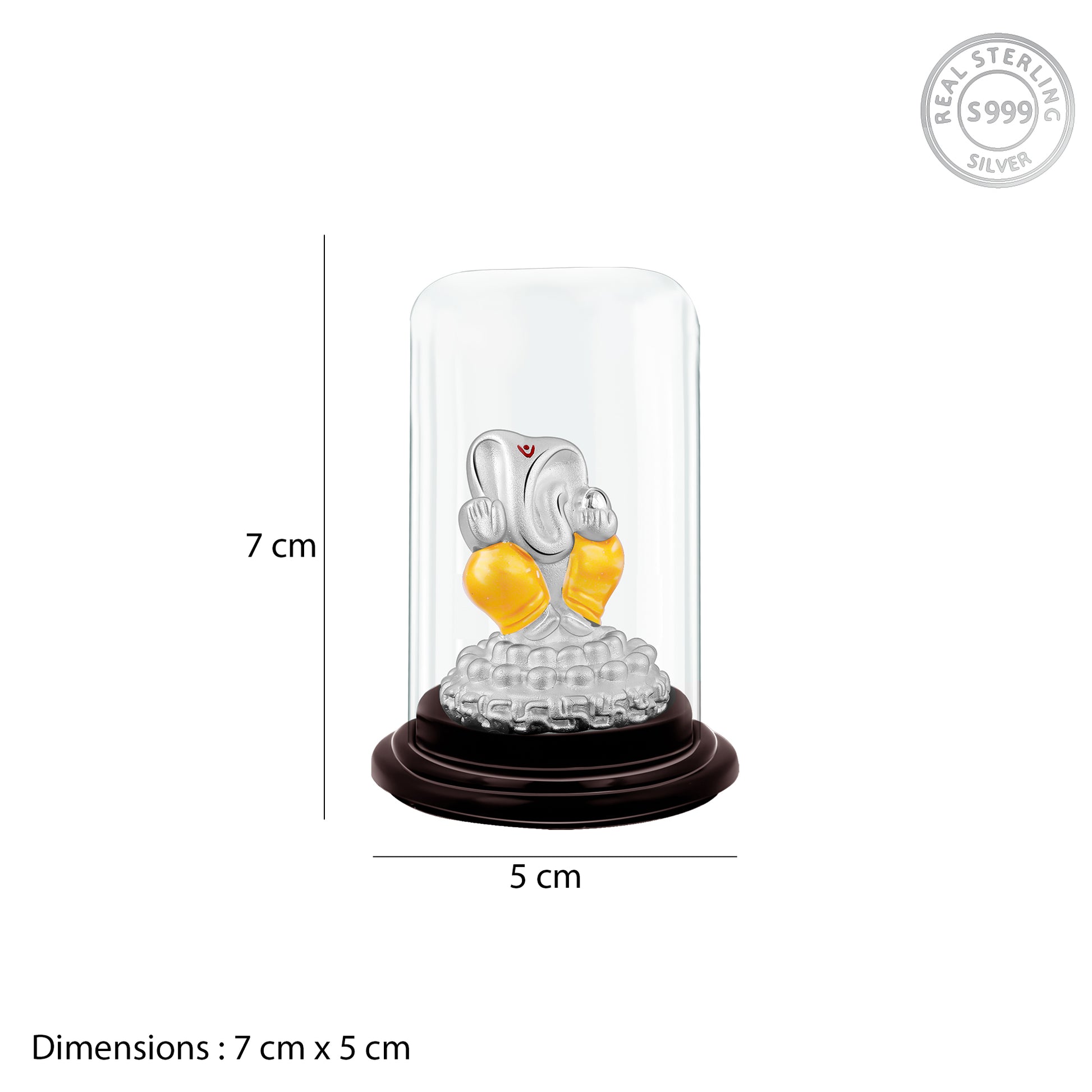 This beautiful silver Lord Ganesha idol is of a seated Ganapati, with yellow enamel on the dhoti, and is covered with a decorative dome glass.