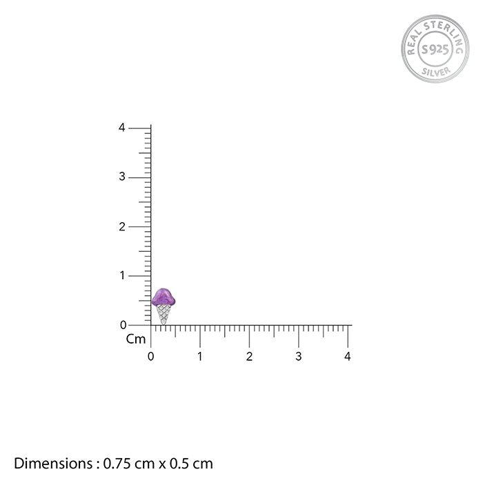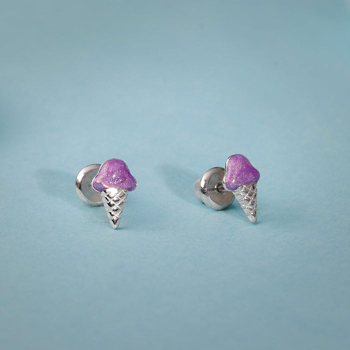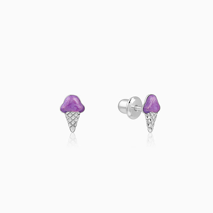 These silver studs for kids feature an ice cream motif. The cone is crafted with fine detailing, while the scoop is coated in a vibrant purple enamel.