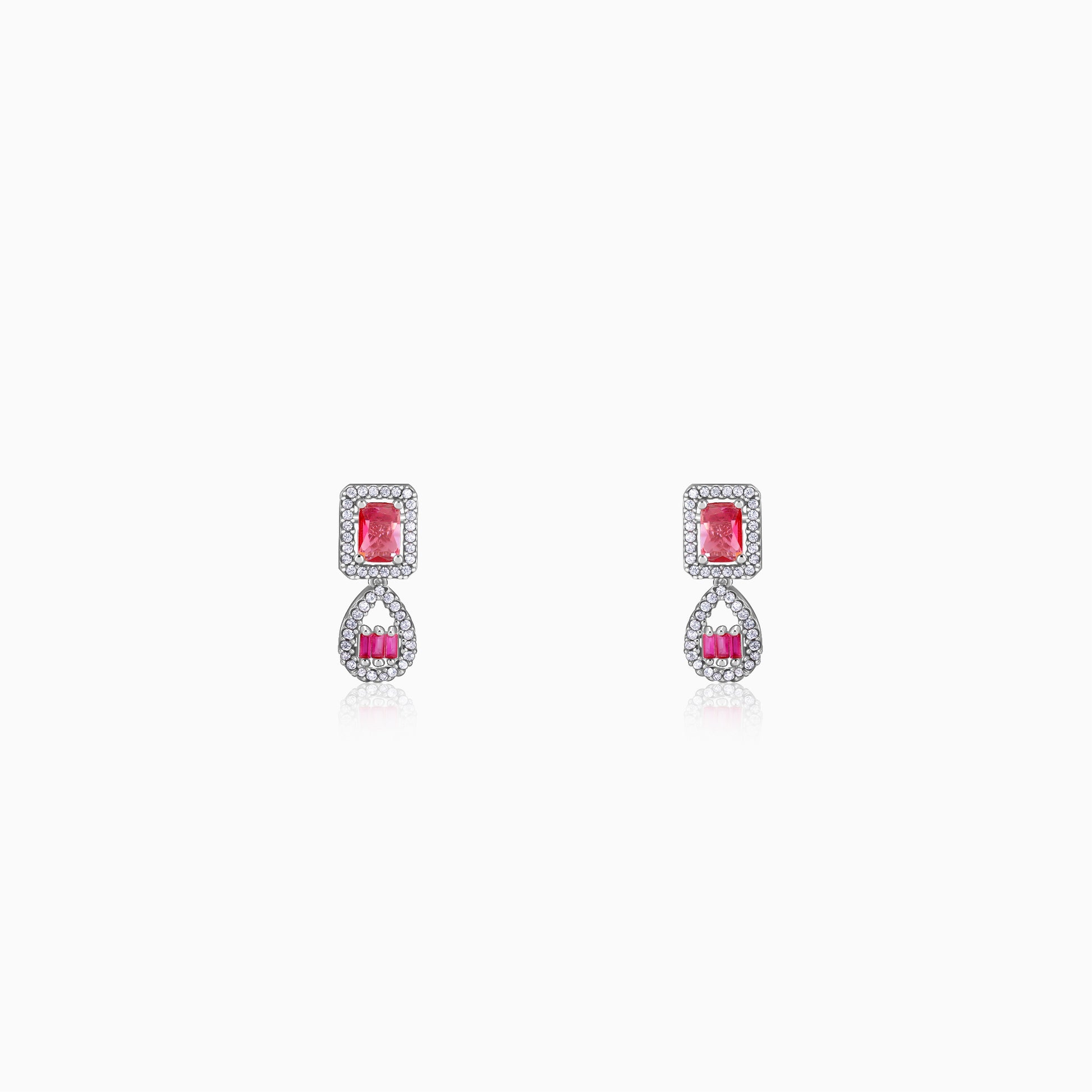 Inspired by the grandeur of royal courts and heirloom geometry, these silver earrings feature soft pink centre stones framed by baguette and emerald-cut zircons. The blush tones paired with sharp structure create a refined yet striking design.