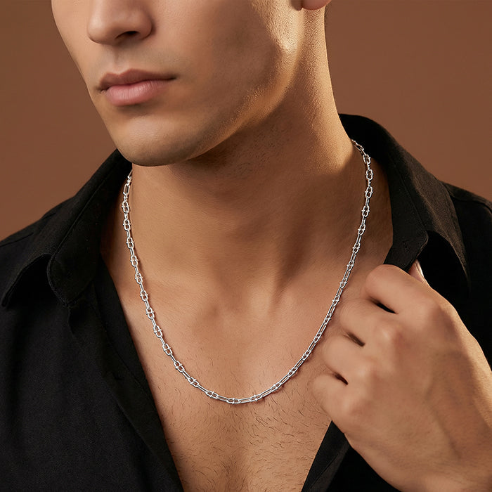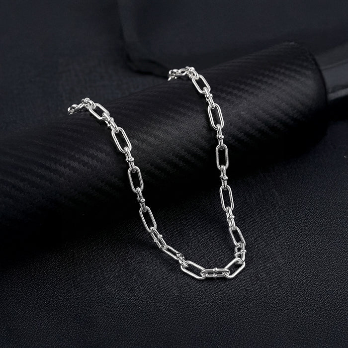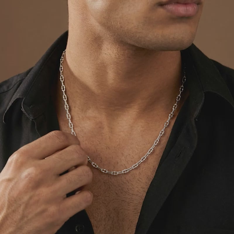 Sharp lines. Strong intent. The elongated paperclip structure is softened with smooth silver beads, creating a chain that feels both commanding and versatile.
