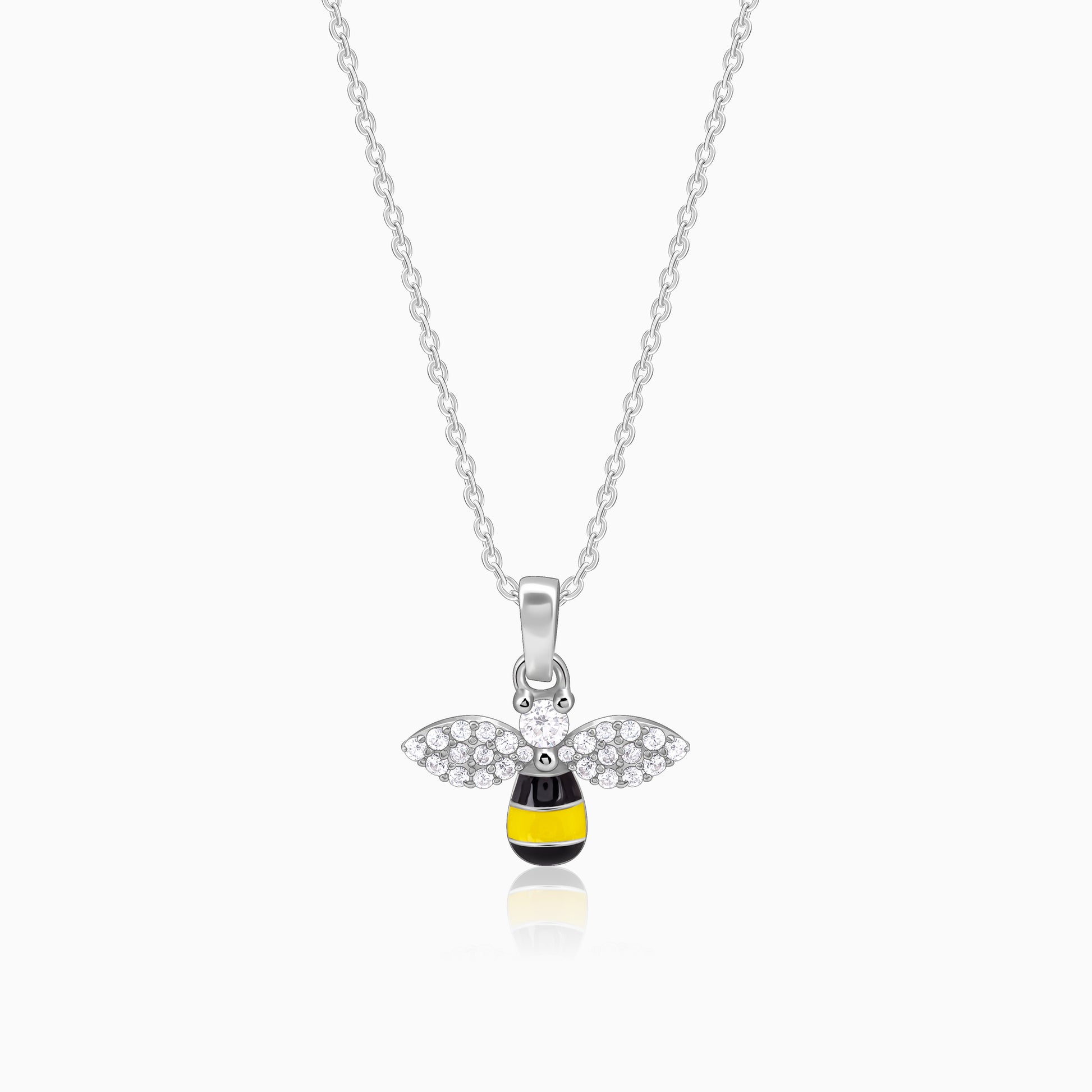 This silver pendant for kids comes with a link chain, featuring a charming bee design. Accented with vibrant coloured enamel, sparkling zircon-studded wings, and a dazzling zircon at the top.