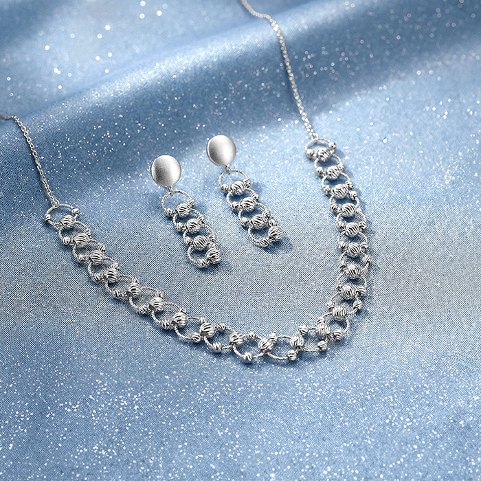 The rhythmic pattern and interlaced structure give it a lively, statement-making presence. This silver jewellery set for women features a matching necklace and earrings. Created for the woman who loves playful, energetic jewellery that shines at every party