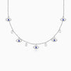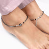 This silver anklet features an evil eye motif with four heart motifs, two on each sides of black beaded chain.