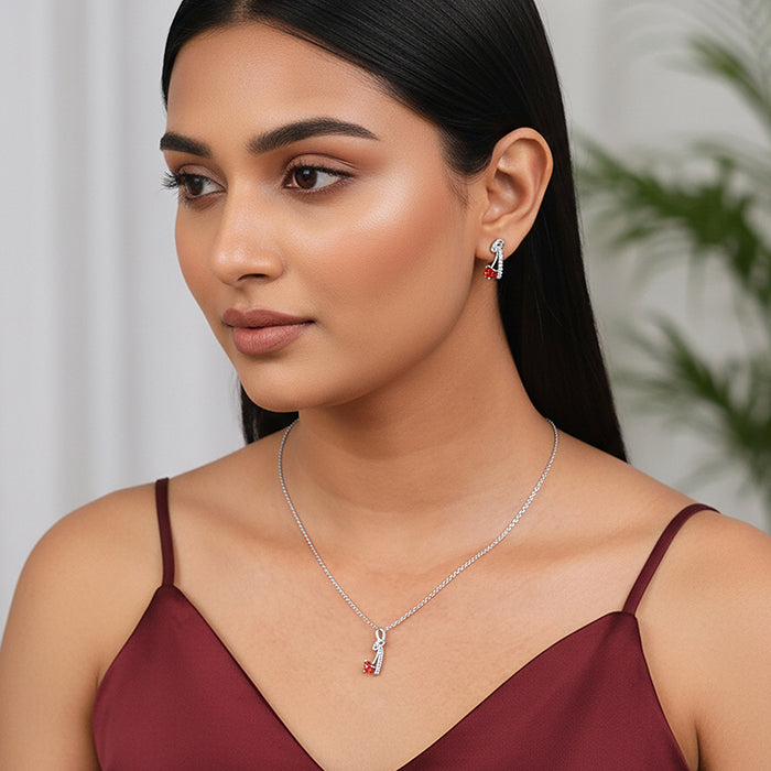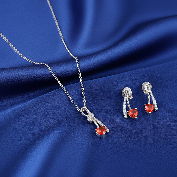 Designed for women who wear emotion with assurance, this silver set captures connection through form and feeling. The pendant and matching silver earrings take shape as a tied ribbon, traced with zircons and finished with a striking red heart. This Valentine’s, we're bringing to you - All Yours - our signature ice-cut stones in soulful shades, because some emotions deserve more than words.