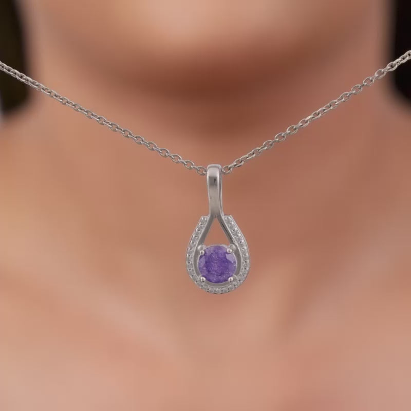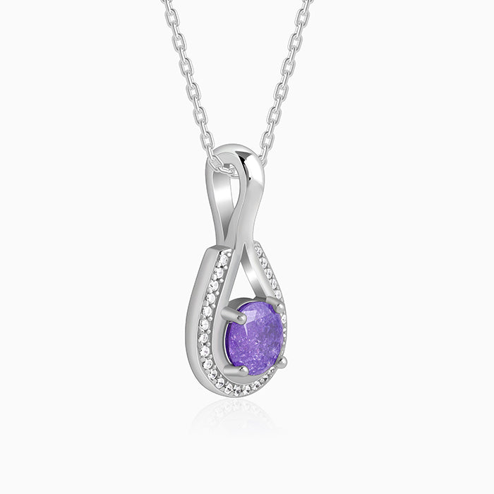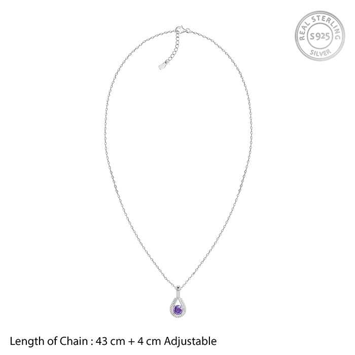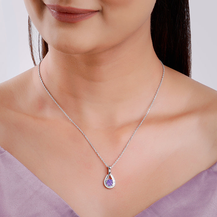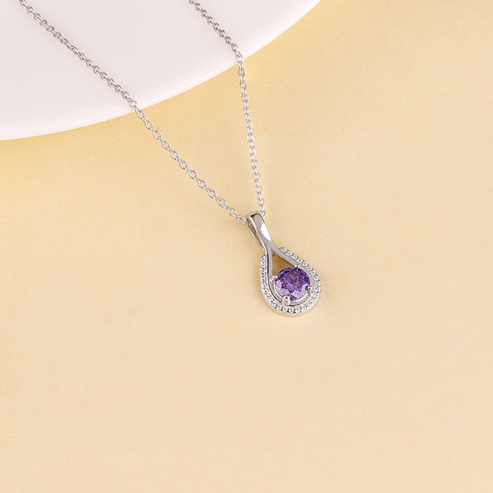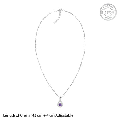 This silver pendant for women features a coloured stone set within a teardrop-shaped frame. The frame is beautifully accented with smaller zircon stones.