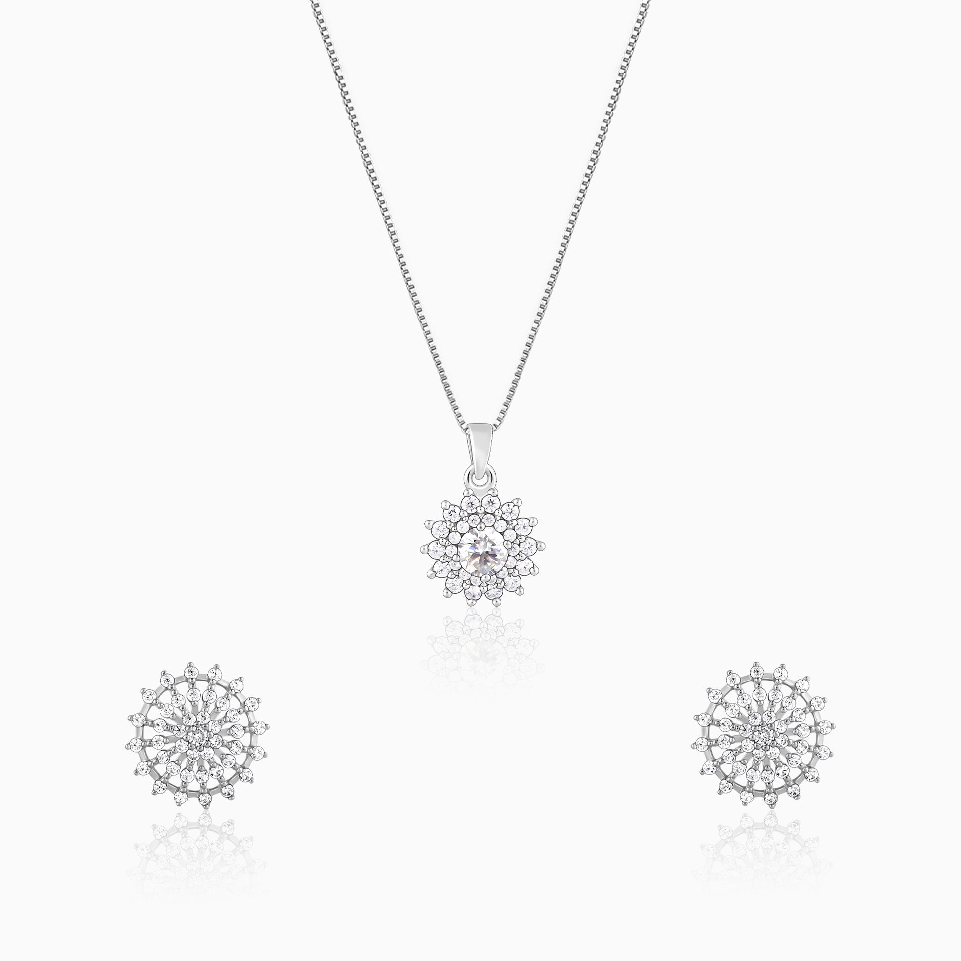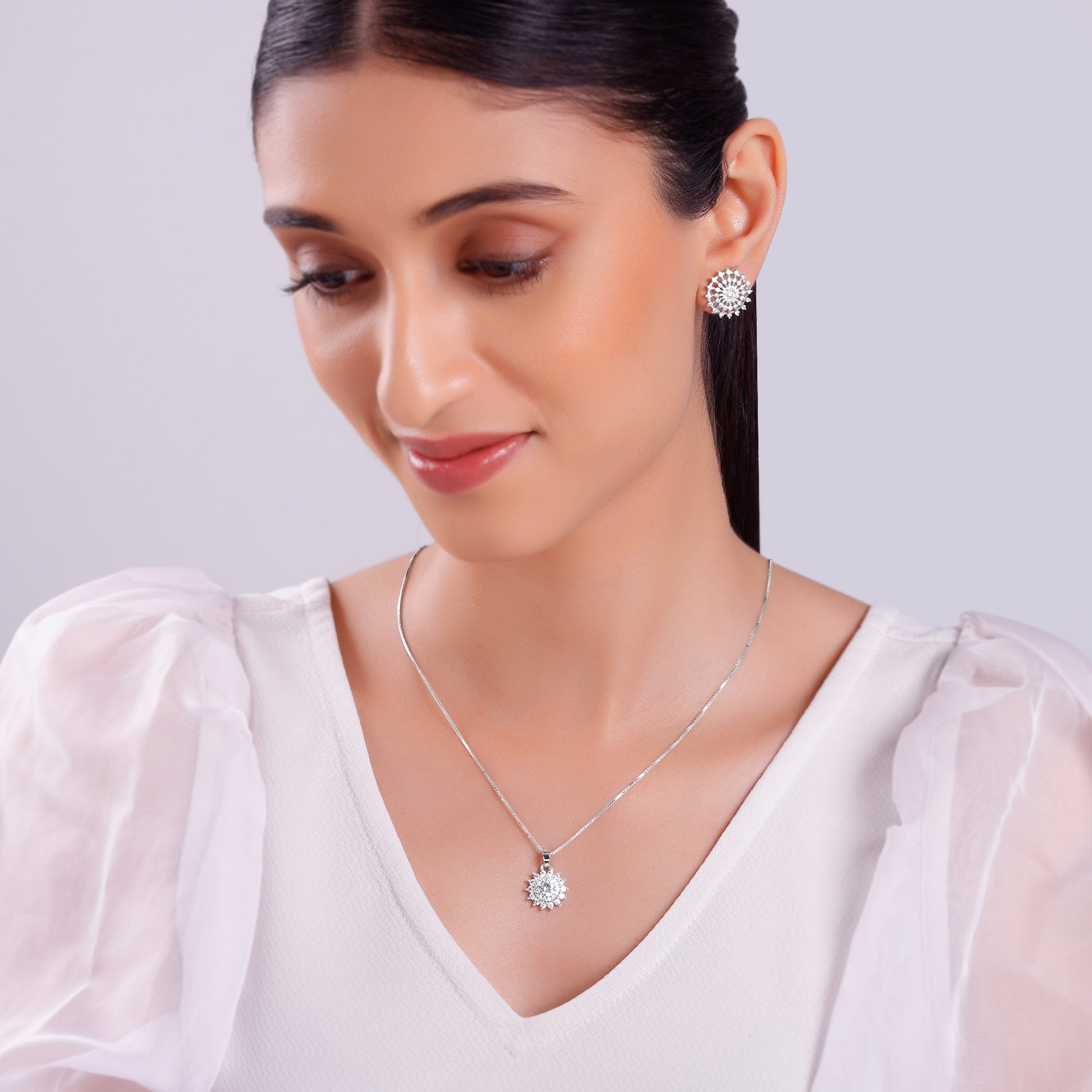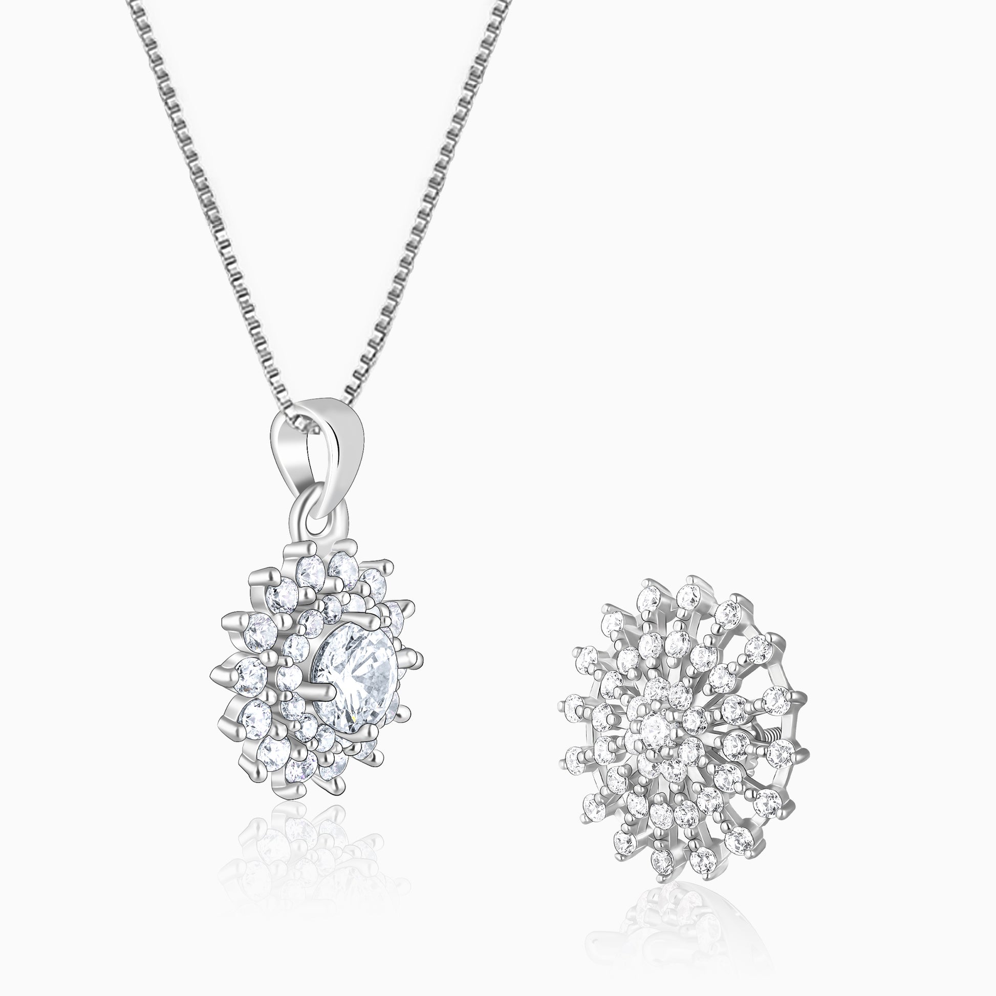 Call this set as your glow buddy. Petals, shimmer, and all the happy vibes included. This set for women features a pendant and earrings. This set appears to be a blend of floral motifs studded with zircons.