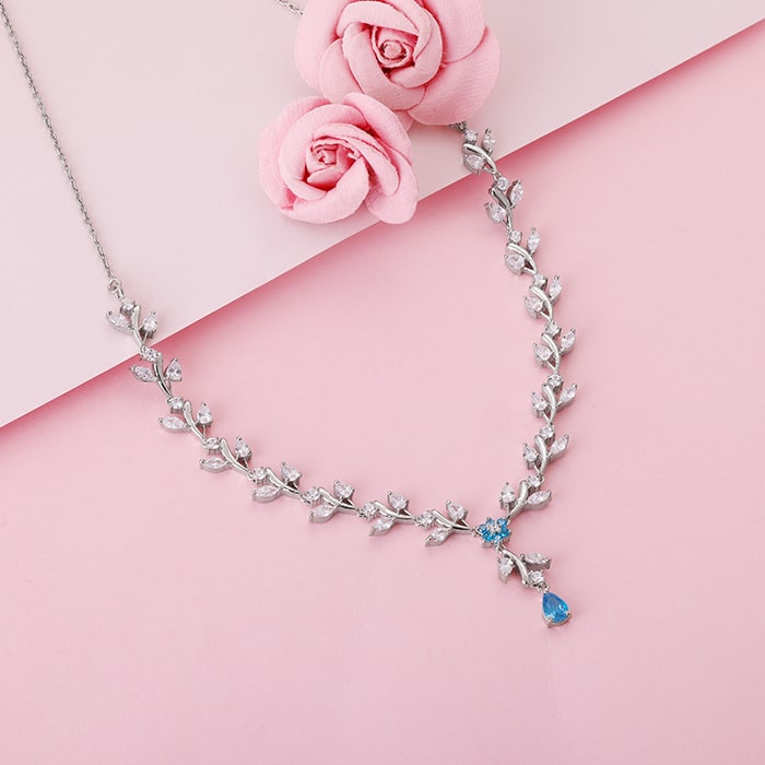 This beautiful silver necklace features zircon-studded leaves and a delicate blue stone-studded flower.