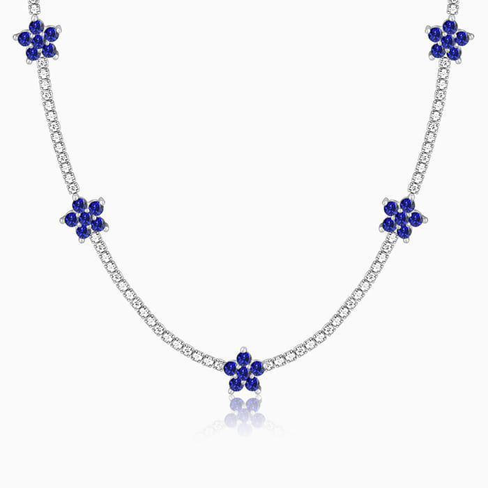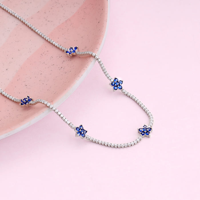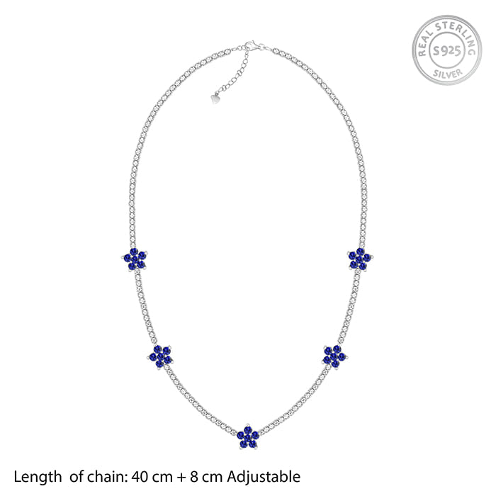 This silver necklace features five flower motifs each with blue-coloured stones, while the chain is studded with zircons.