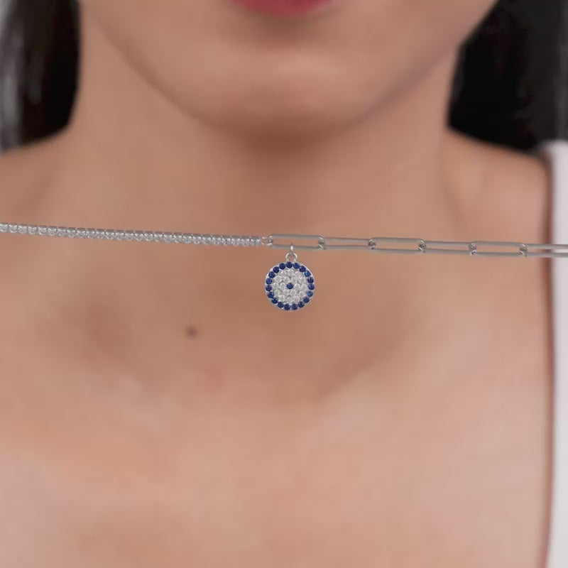 This silver bracelet for women features a modern half-and-half design, with one side featuring a line of zircons and the other a bold paperclip chain. A vibrant blue and white evil eye charm provides a striking focal point at the juncture.