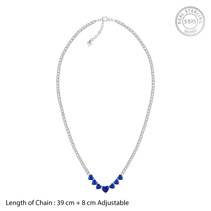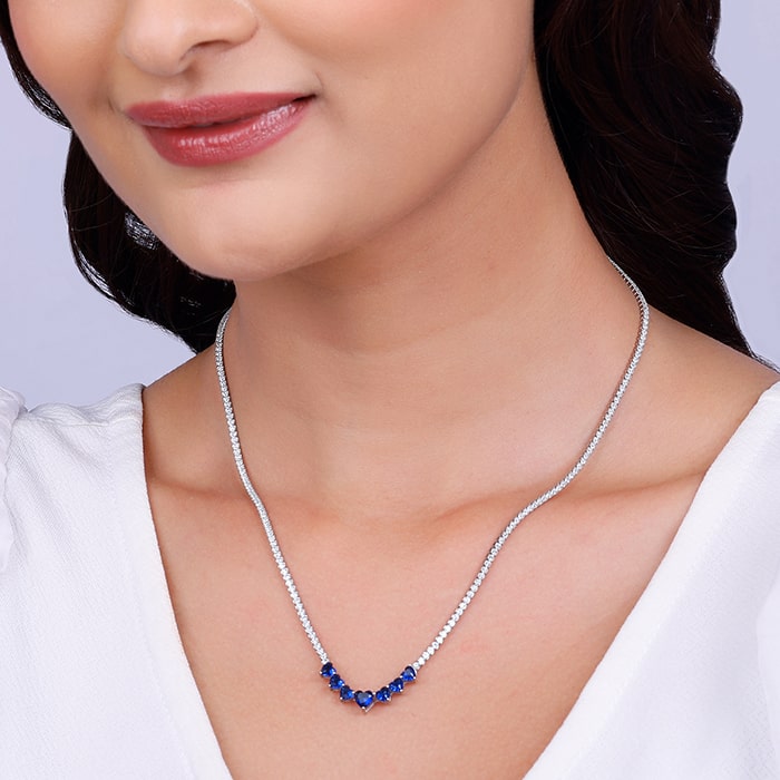 This silver necklace features seven heart motifs, each adorned with a blue-coloured stone while the chain is studded with zircons.