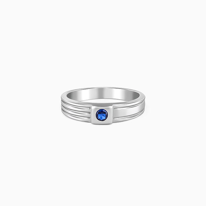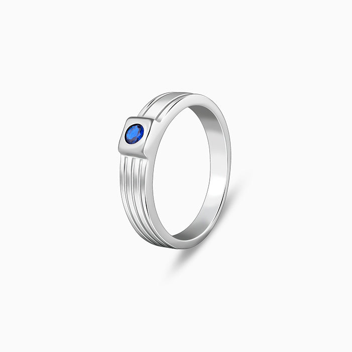 This silver mens ring features a deep blue stone set in a clean bezel design. The sleek band is finished with fine grooves.