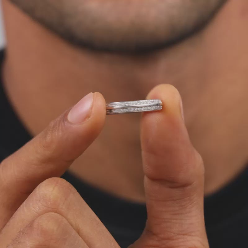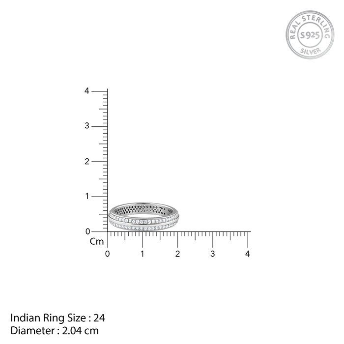 This silver mens ring is encrusted with two rows of sparkling zircons all around. A sleek channel separates the two rows.