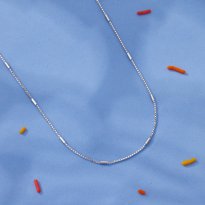 For the kid who never stops moving, giggling or glowing! This silver box chain keeps up effortlessly with every hop, skip and jump.