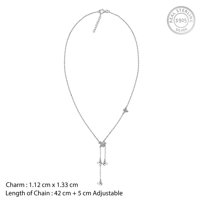 Bring a touch of whimsy to your look with this playful lariat necklace. Multiple butterfly charms, some in silver, others paved with zircon stones cascade down the chain for a fluid, ethereal look.