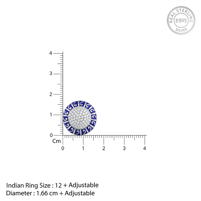 This silver ring for women features a large, round cluster of zircons. The outer border is set with an ornate design and enhanced with blue enamel.