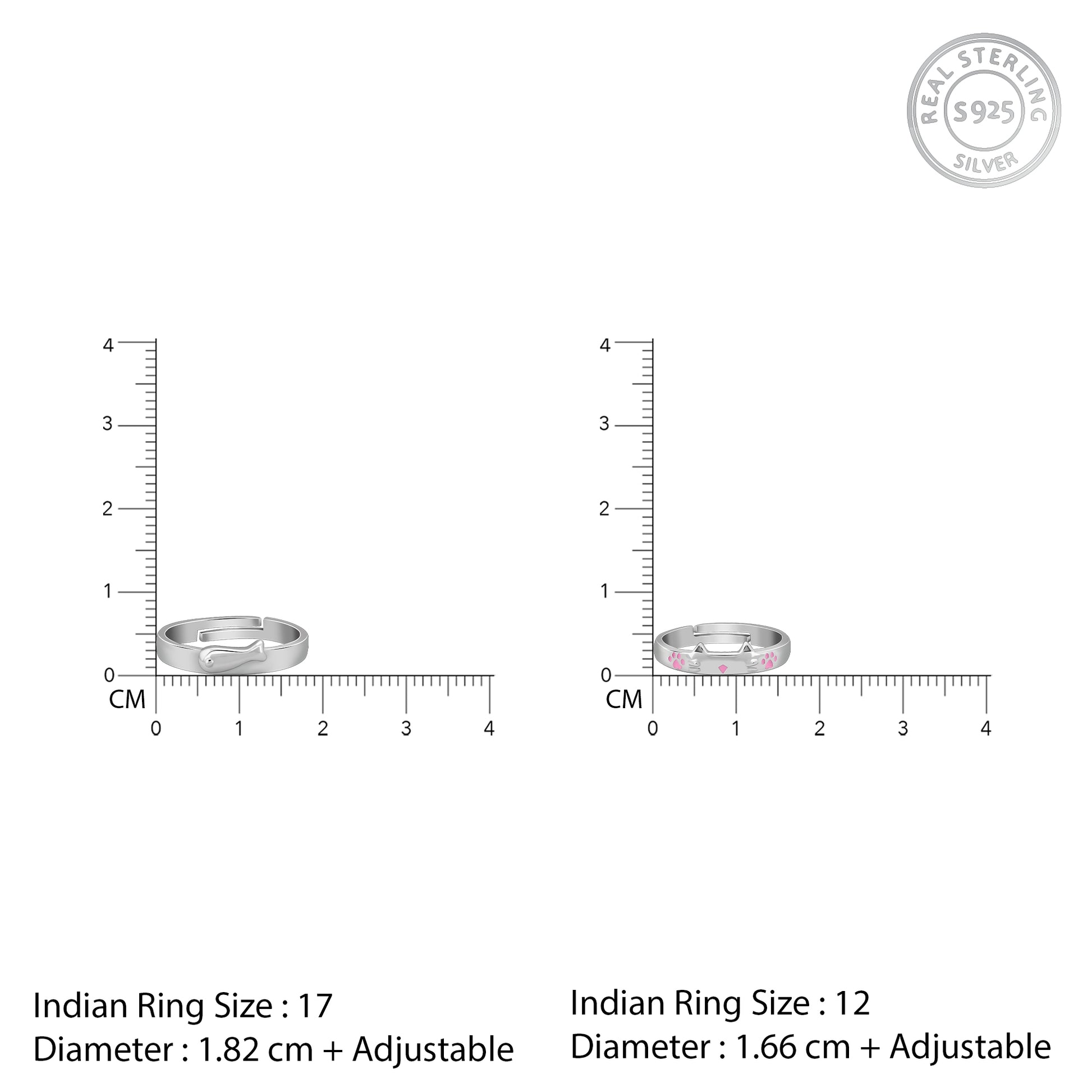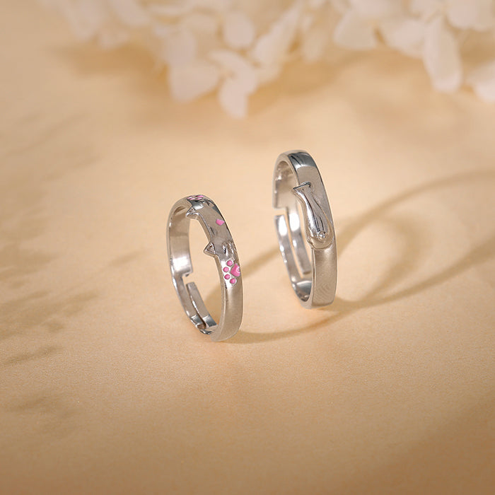 These adjustable silver couple rings comprise a mens ring with a fish motif. The womens ring features paw motifs filled with enamel along with tiny ridges throughout.