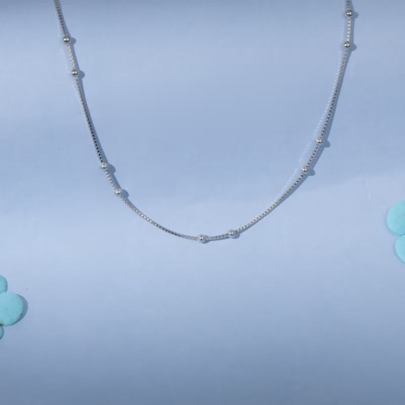 This silver chain is made for little stars who love to shine their way through the day! it features a box chain design with evenly spaced silver beads.