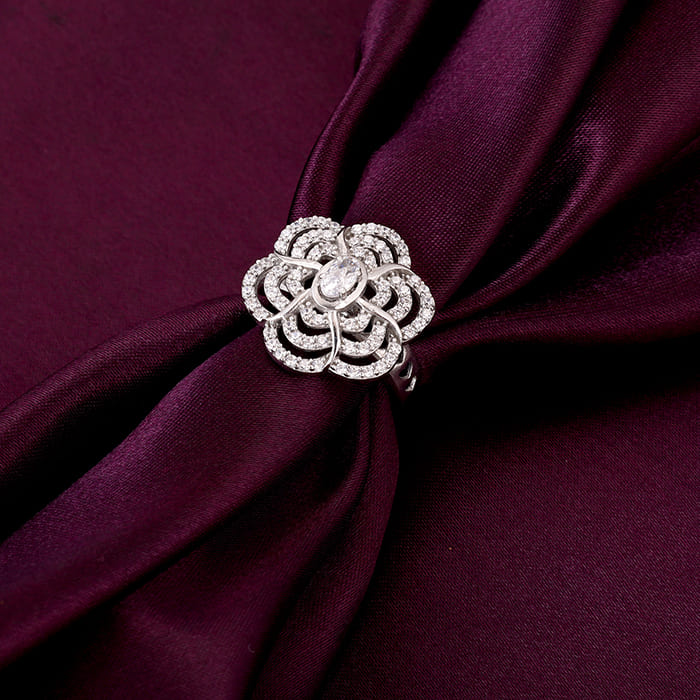 This silver ring has an intricate flower motif with a large zircon in the middle and wave-like designs studded with zircons.