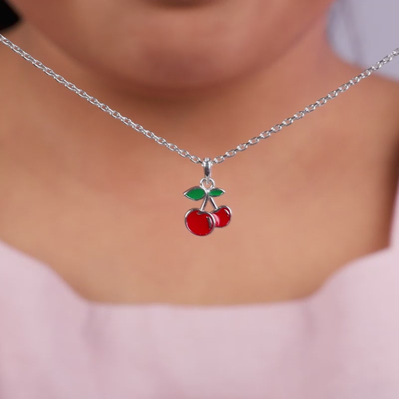 This silver pendant for kids features two vibrant red cherries with bright green leaves, crafted in a glossy enamel finish.