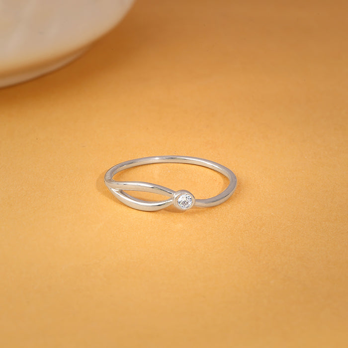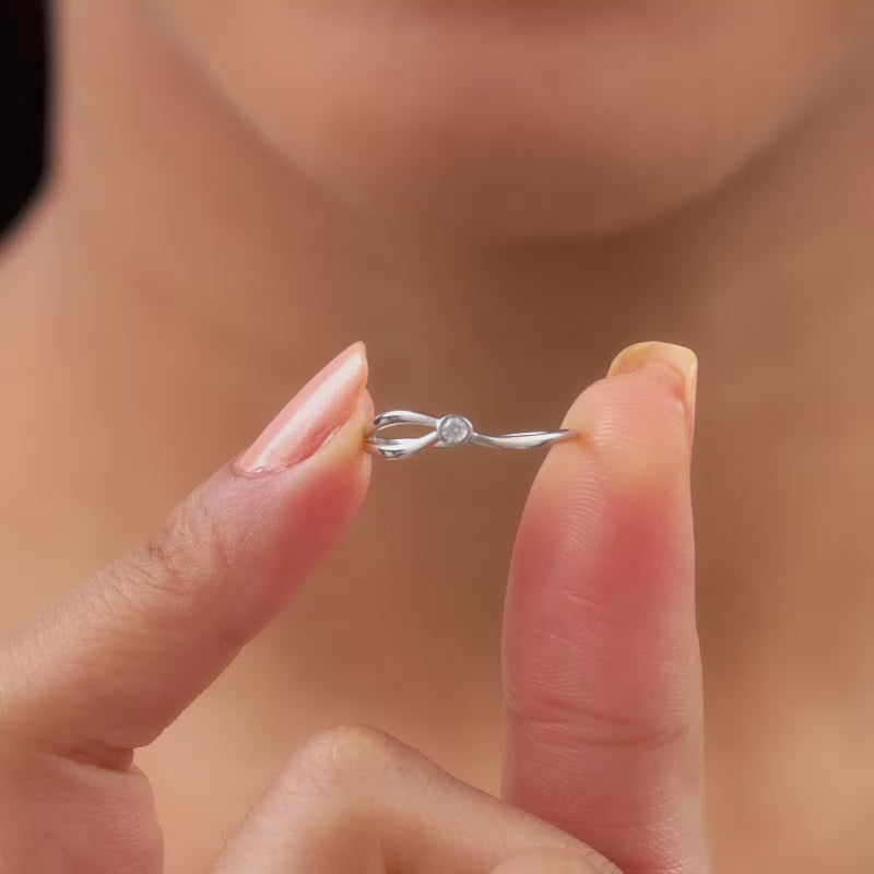This silver ring for women features a sleek, flowing design with a central knot set with a bezel zircon.
