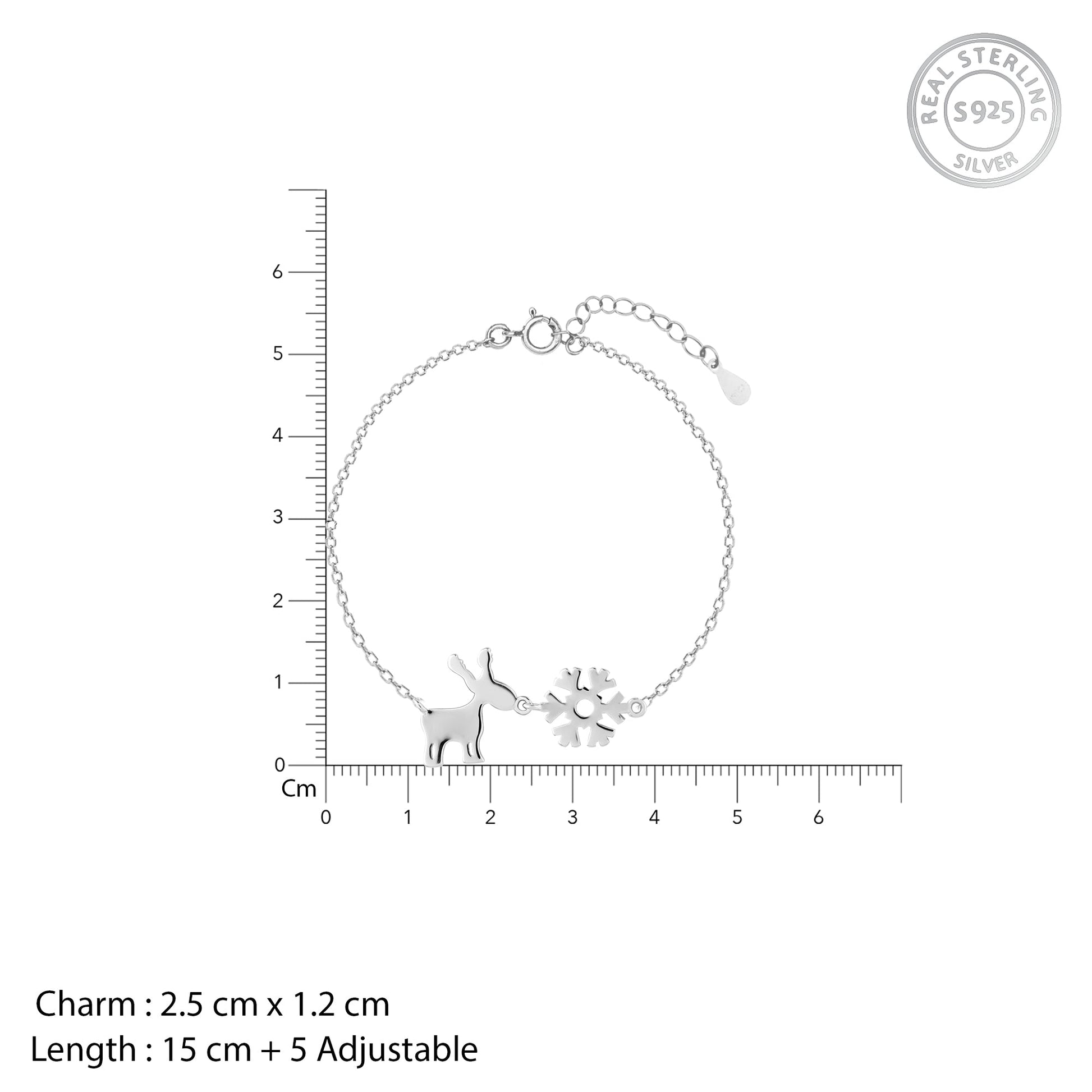 This silver bracelet has a motif of Rudolph the reindeer chasing a snowflake, lending this bracelet an adorable look.