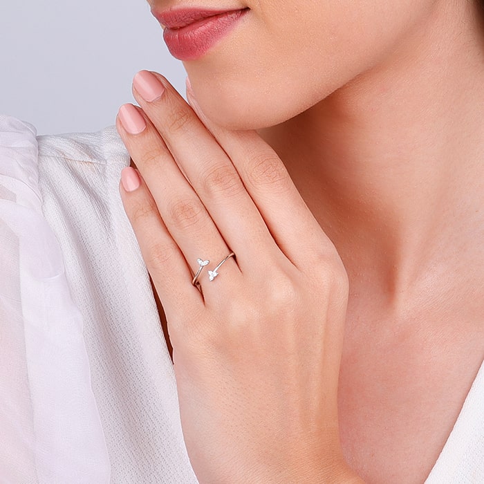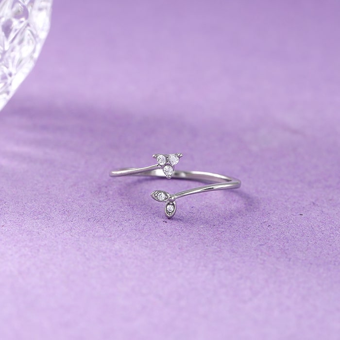 This silver ring features an open design with one end showcasing a zircon-studded flower motif and the other adorned with two leaf motifs, also studded with zircons.
