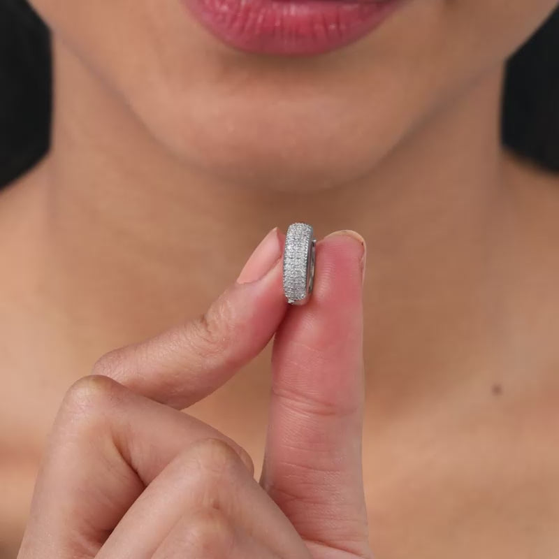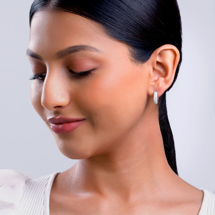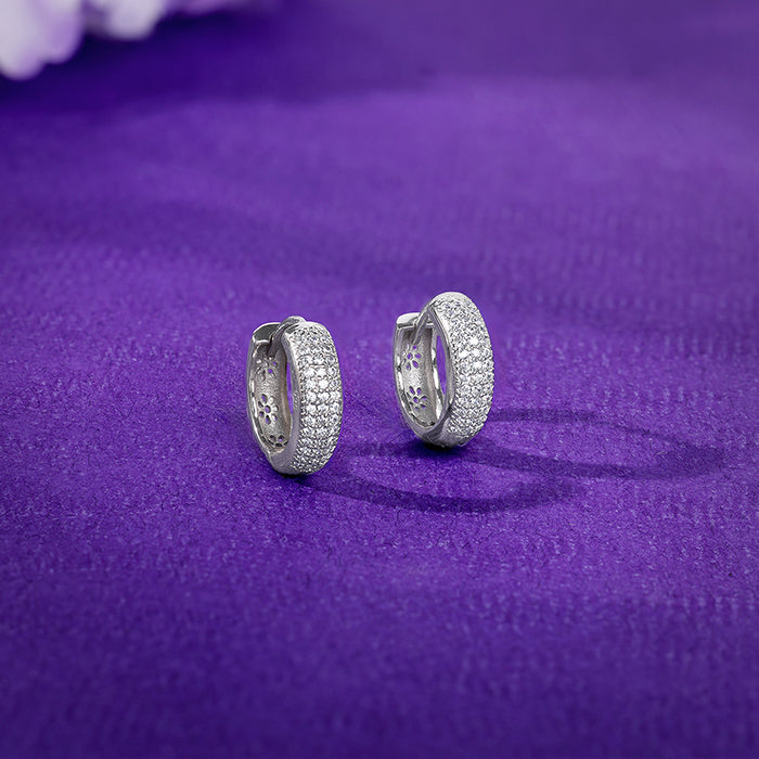 These silver earrings for women feature hoop designs studded with zircons.