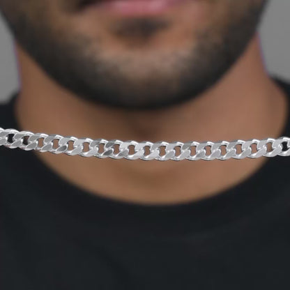 The silver bracelet for men is has a curb chain design with a lobster claw clasp closure.