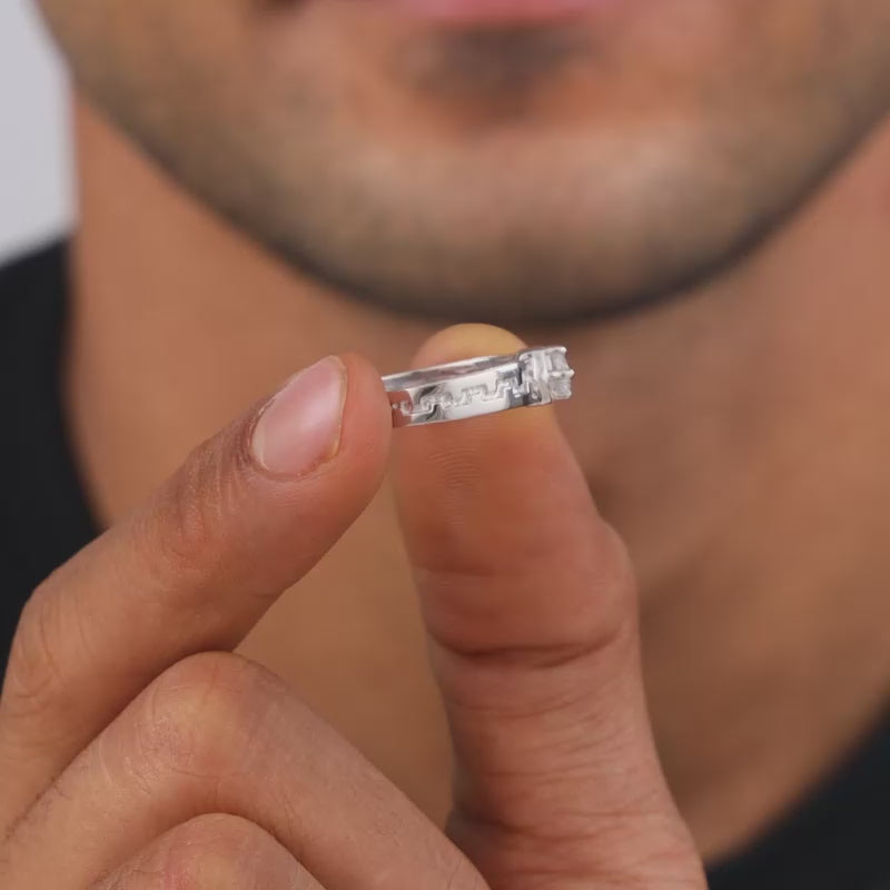 Inspired by the gentleman’s charm, this men’s ring elevates your effortless style. Featuring a hexagon design with a striking central zircon and a uniquely detailed band, it’s a timeless piece for the modern man.