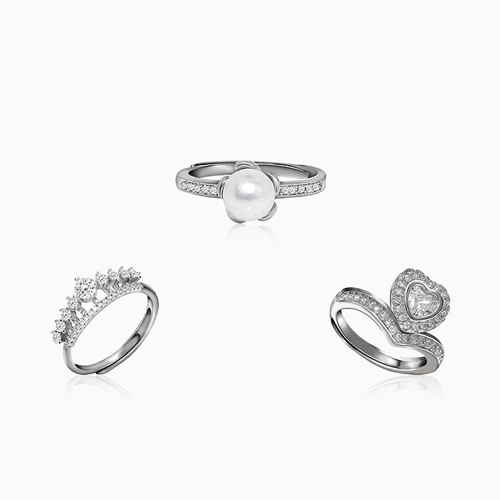 The Silver Classics Ring Set has a silver crown ring with the pinnacle studded with zircons, a pearl flower ring and a crown heart ring.
