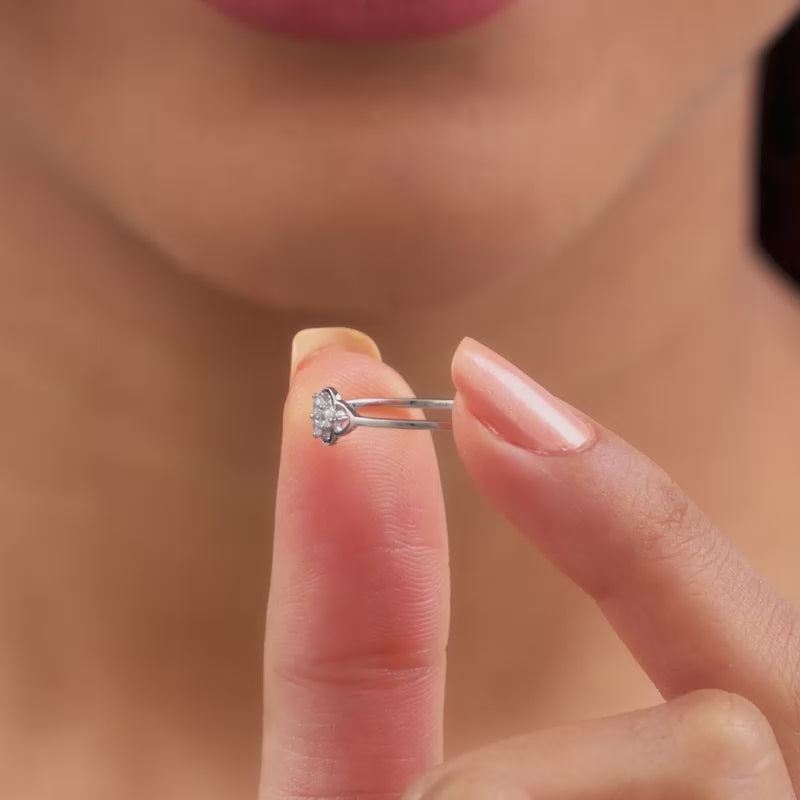 This silver ring for women features a graceful clover design. A cluster of three small, circular zircons forms a subtle triangle at its centre.