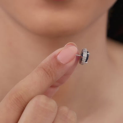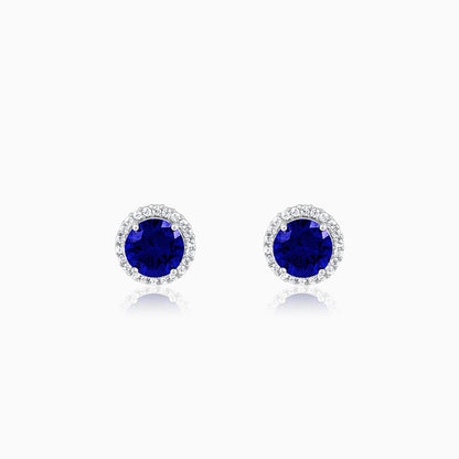These womens silver earrings each feature a circular shape with a coloured stone at the centre, surrounded by zircons, creating a halo design.