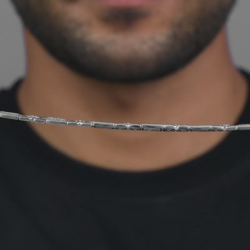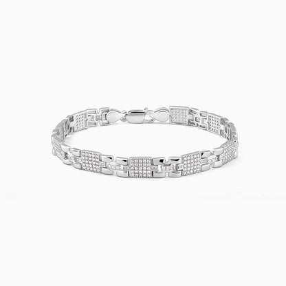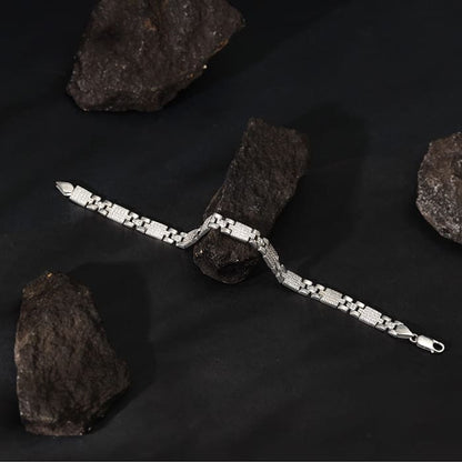 This textured silver bracelet features a box pattern or presidential pantera link design.