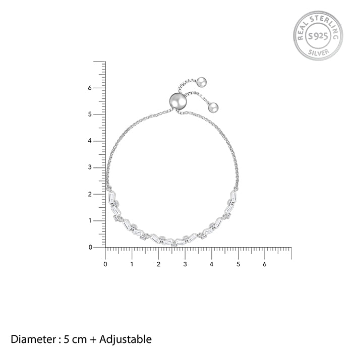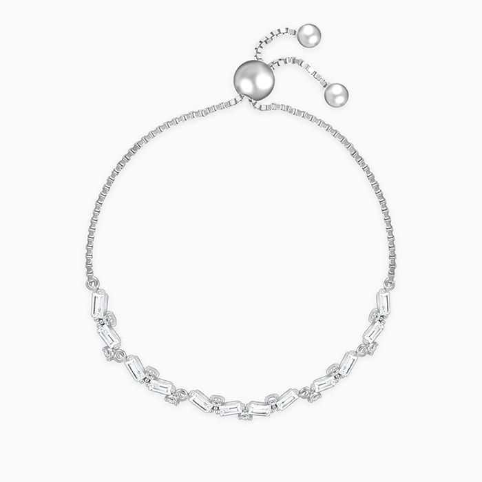 This silver bracelet features rectangular zircons placed in a crisscross manner with circular zircons adjoining them.