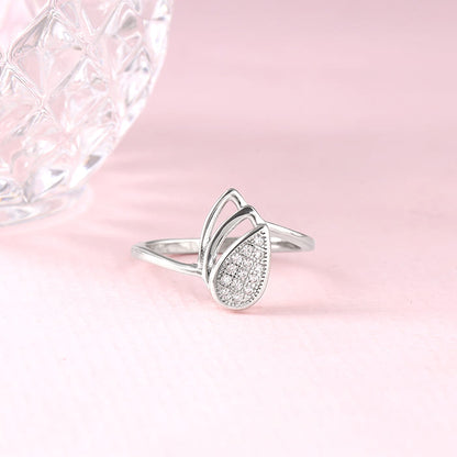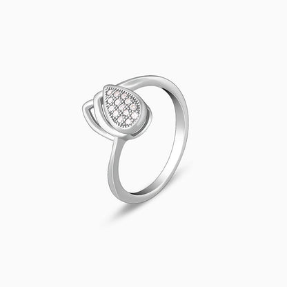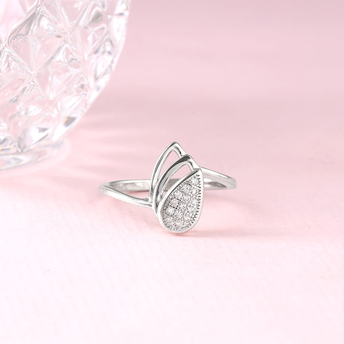 This silver ring features a spreading of three petal designs, one adorned with zircons.