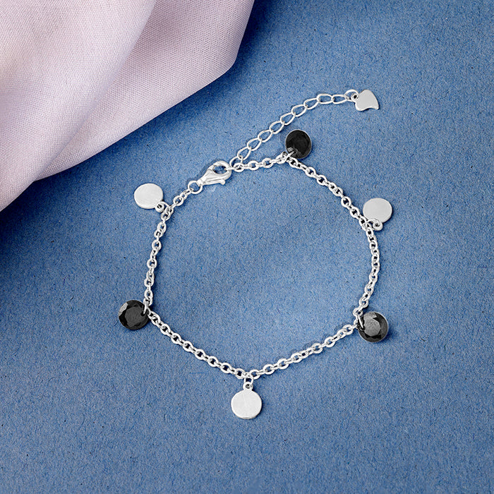 This silver bracelet for women features an alternating pattern of evenly spaced polished silver disc charms along the chain.