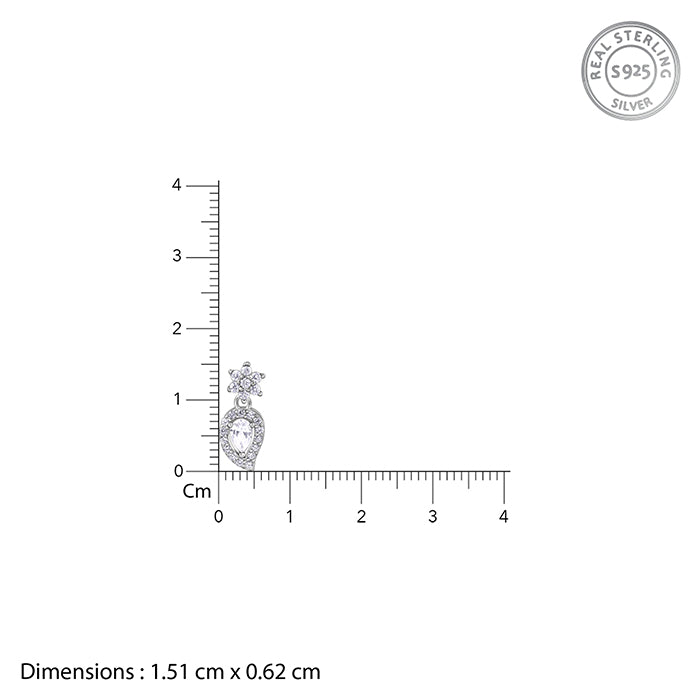 She chooses jewellery that shines with confidence and style. These silver earrings are studded with zircons and feature a pear-shaped centrepiece, creating a balanced, radiant look that complements any ensemble.