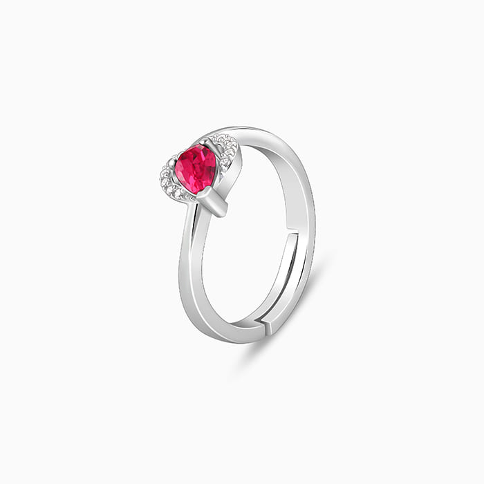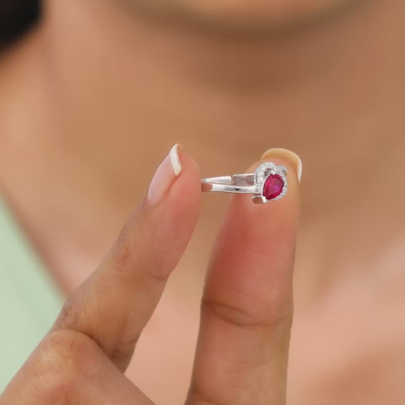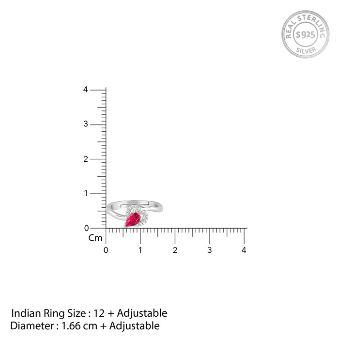 This silver ring for women features a heart motif accented with zircon stones, and a pear-shaped drop placed inside it.