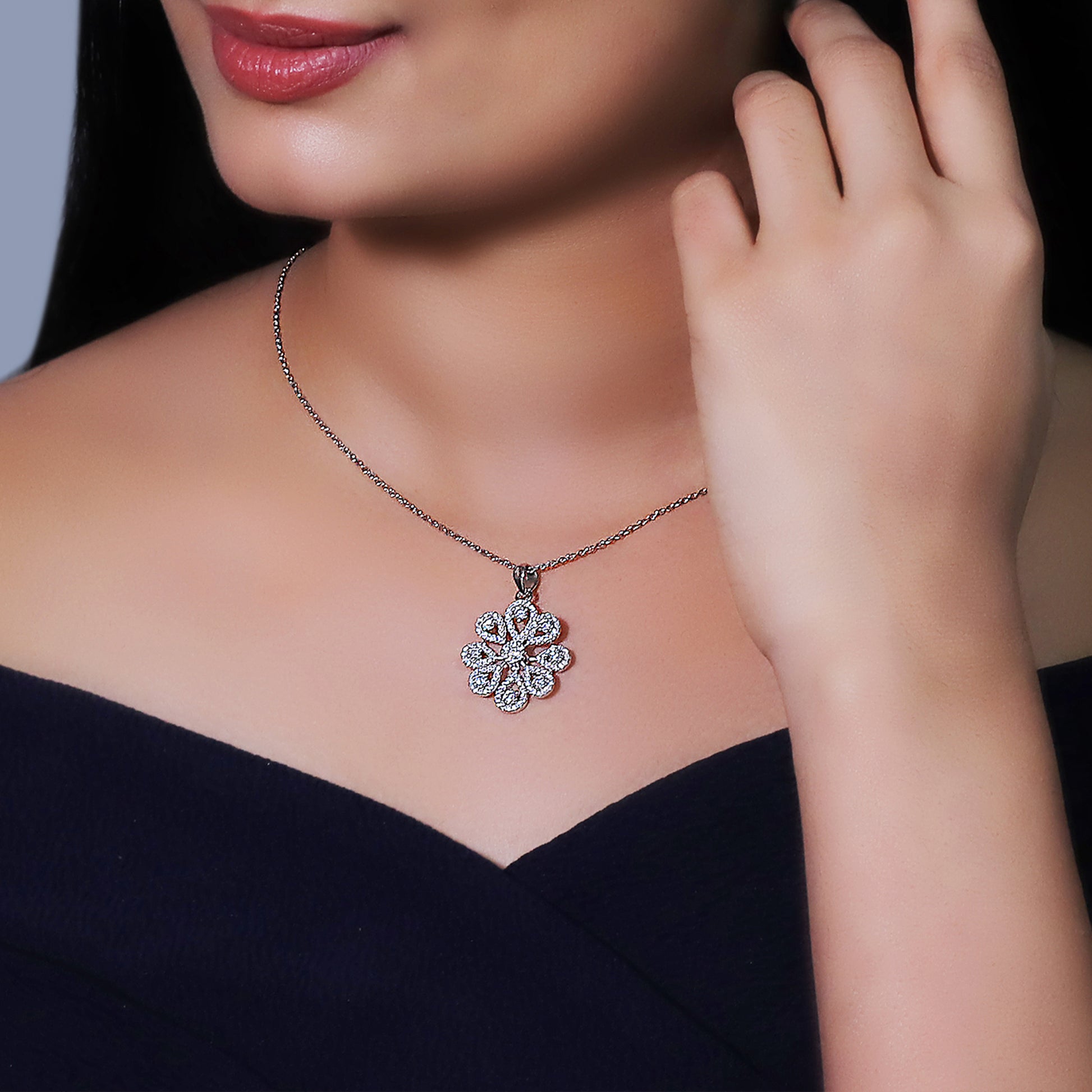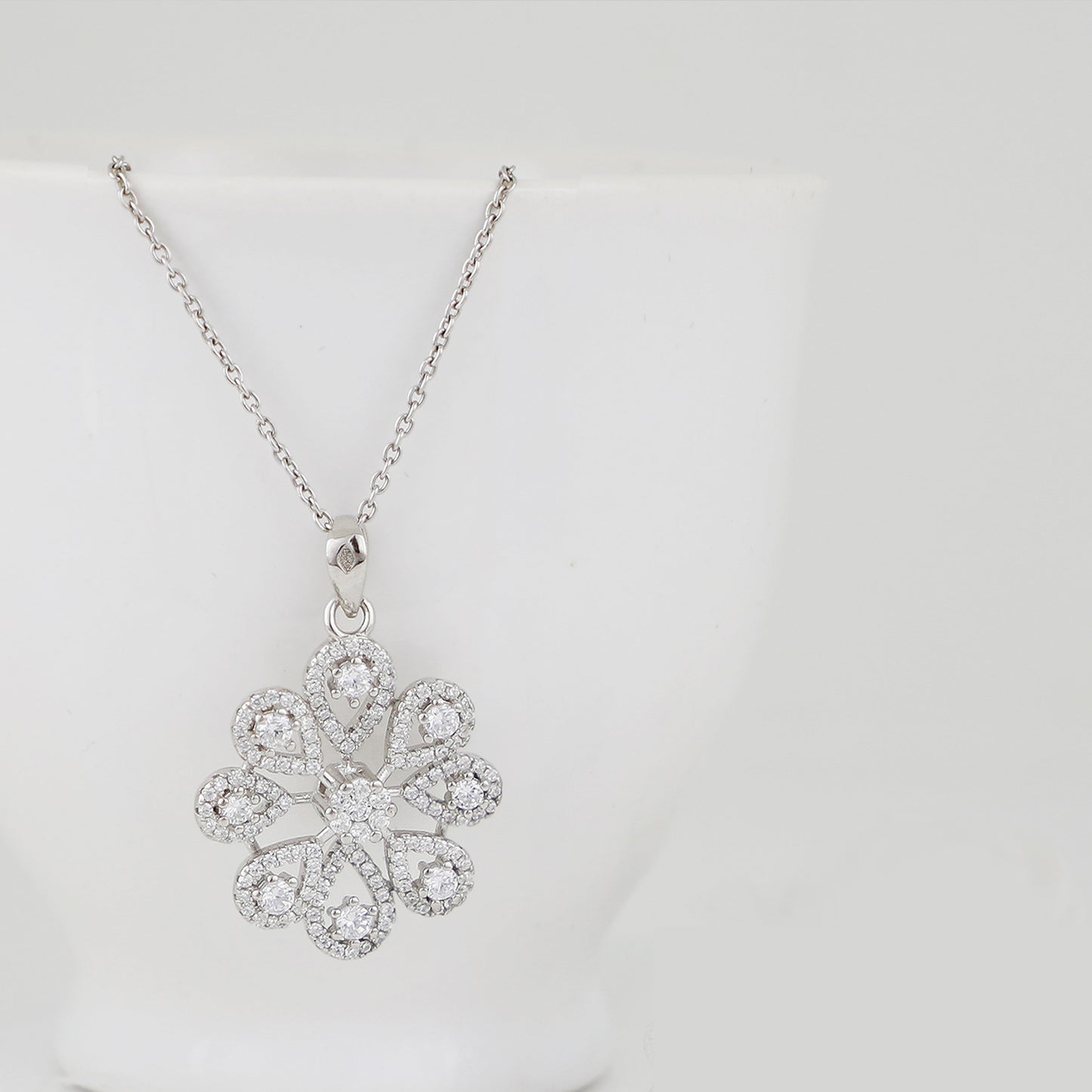 This pendant has a flower with intricately designed, zircon-studded petals.