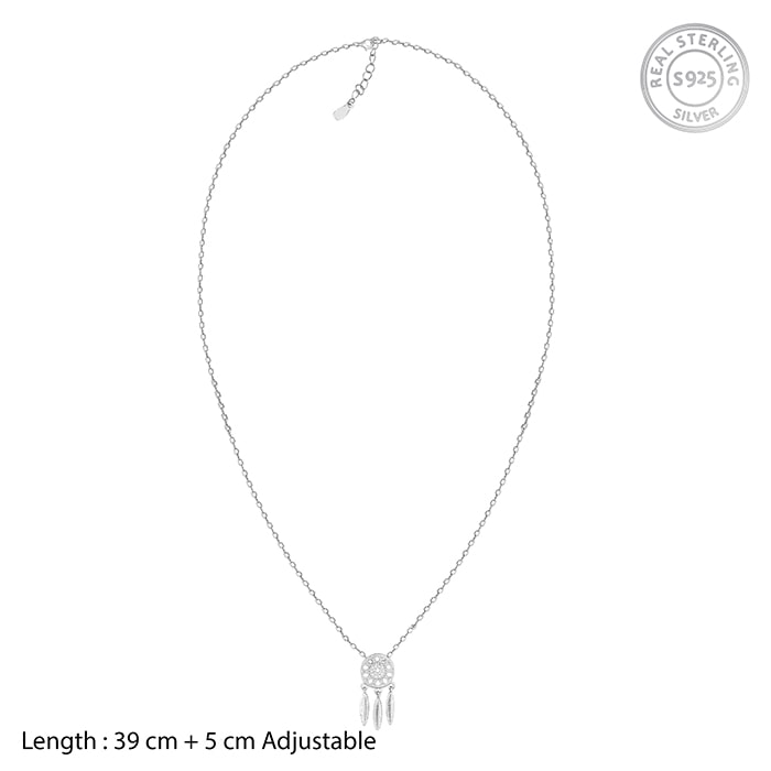 The silver set has a necklace, a pair of earrings and a bracelet that has a dreamcatcher design with feather like shapes dangling from it.