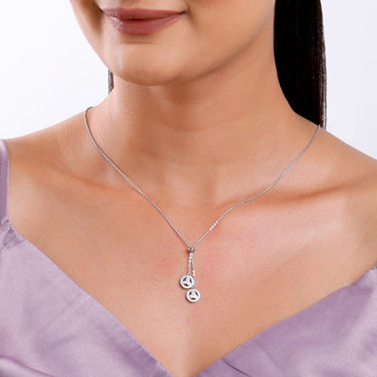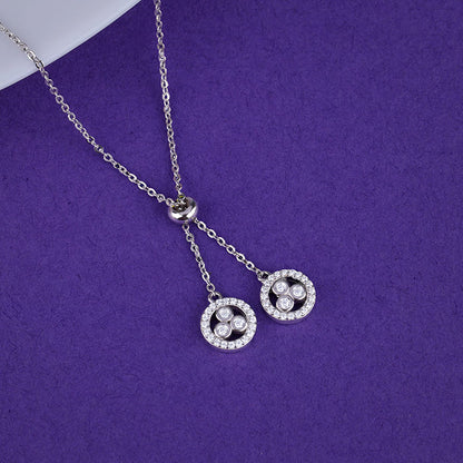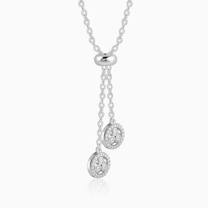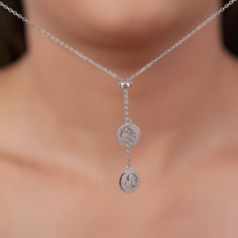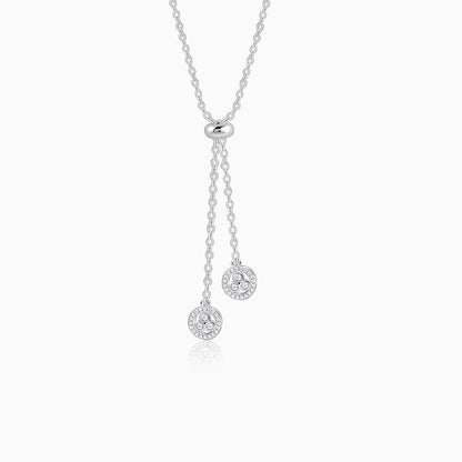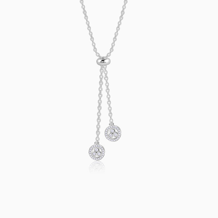 This silver necklace for women features two circular charms suspended from a central link on the chain. Each charm is bordered with sparkling zircons and three larger, bezel-set circular zircons at its centre.